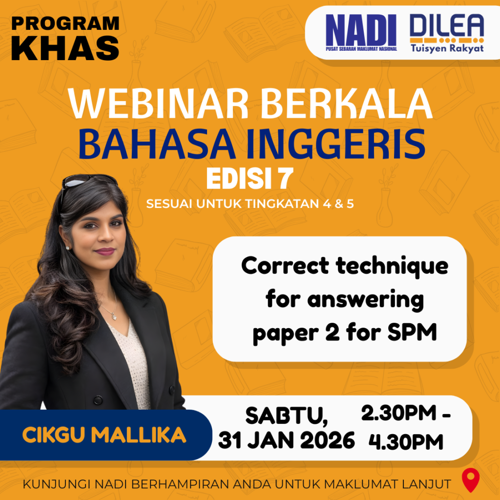 Masih keliru cara menjawab Paper 2 Bahasa Inggeris SPM walaupun dah faham soalan? Tak tahu teknik yang betul untuk dapatkan markah maksimum? Jangan risau! Jom sertai Webinar Berkala Bahasa Inggeris โ Edisi 7 yang akan bongkarkan teknik menjawab Paper 2 dengan betul, tersusun dan berkesan! ๐ฌ๐งโจ