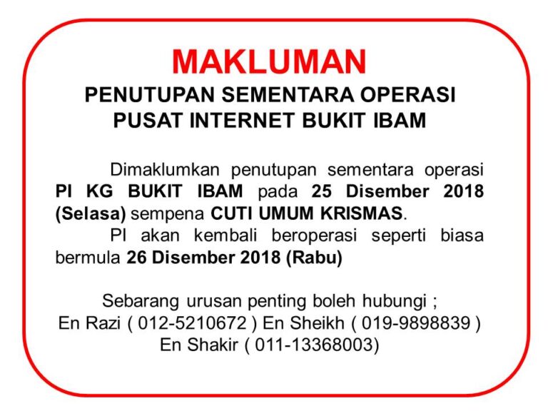 [Makluman Awal] Untuk makluman, Pusat Internet Kampung Bukit Ibam tidak beroperasi pada esok 25 Disember 2018 (Selasa) sempena Cuti Umum Hari Krismas. Pusat internet akan beroperasi seperti biasa pada 26 Disember 2018 (Rabu).
