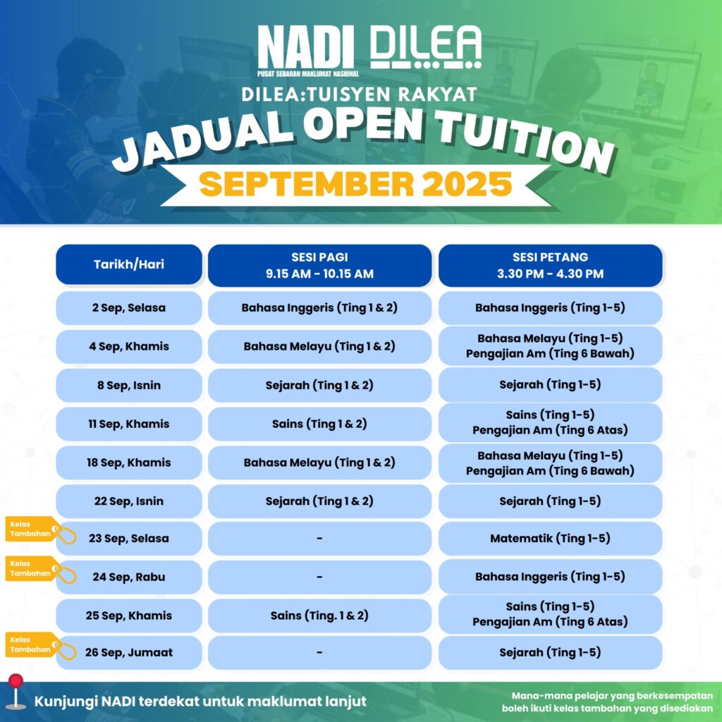 Sukacita dikongsikan jadual terkini bagi program Open Tuition untuk bulan September 2025.