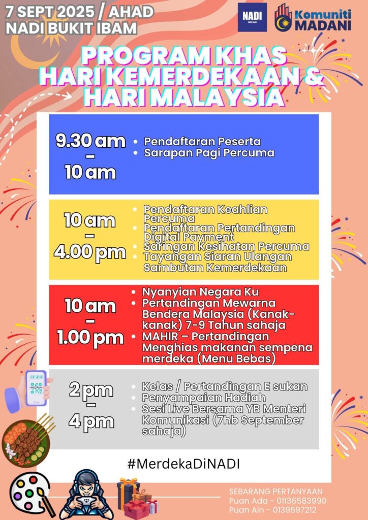 | 1. Saringan Kesihatan Percuma – Menyediakan pemeriksaan kesihatan asas untuk komuniti secara percuma. 2. Tayangan Siaran Ulangan Sambutan Kemerdekaan – Menghidupkan semangat kemerdekaan melalui tayangan bersama. 3. Kelas / Pertandingan E-Sukan – Aktiviti moden yang melibatkan golongan muda dan peminat sukan digital. |